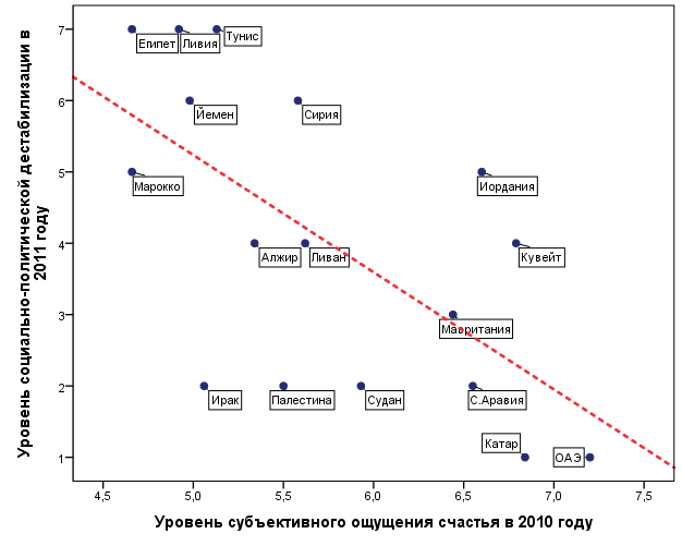 Российские социологи Андрей Коротаев и Алиса Шишкина решили проверить эффективность субъективного счастья в качестве метрики относительной депривации на данных стран «арабской весны». Они их ранжировали по индексу социально-политической дестабилизации. Его значение — от 1 до 7 — соответствовало масштабу и последствиям протестных действий, произошедших в государстве. Если акции были редкими и малочисленными, то индекс равнялся 1, как, например, в Катаре и Объединенных Арабских Эмиратах. Если в стране произошла революция (Египет, Ливия и Тунис), то ей присваивался наивысший 7 уровень дестабилизации.
