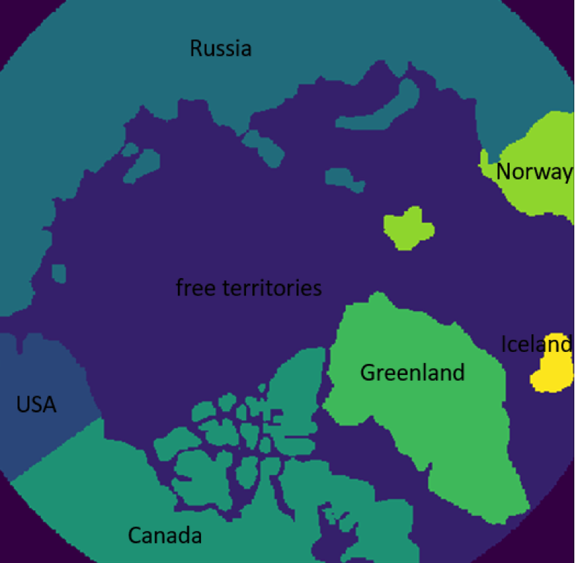 In 1996, the international Arctic Council was established. One of this forum’s aims is to consider claims over some territories. The resource potential of those territories is of interest to many countries, triggering conflicts of interest. The latter can be addressed by means of mathematical methods, distributing area given individual nations’ needs and the locations of natural resources.
